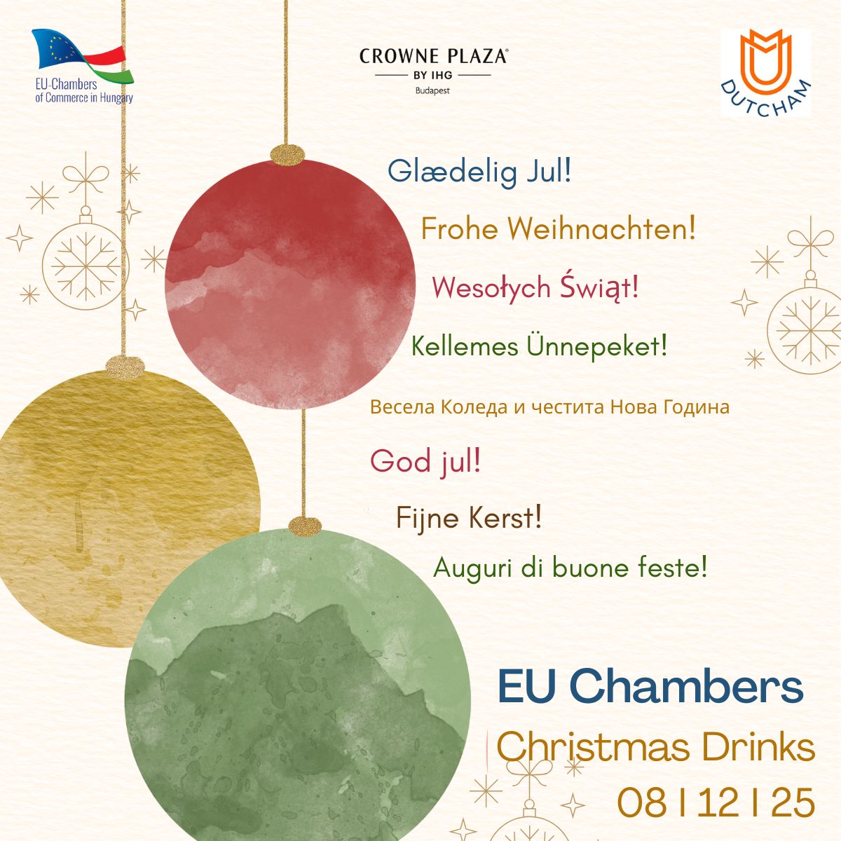 Vegyüljön el az EU Kamarák üzleti közösségének tagjaival egy a Crowne Plaza Budapestben megrendezésre kerülő karácsonyi fogadáson, hogy értékeljék az elmúlt évet, tervezzenek a következőre, és kívánjanakk egymásnak eredményes 2026-ot!