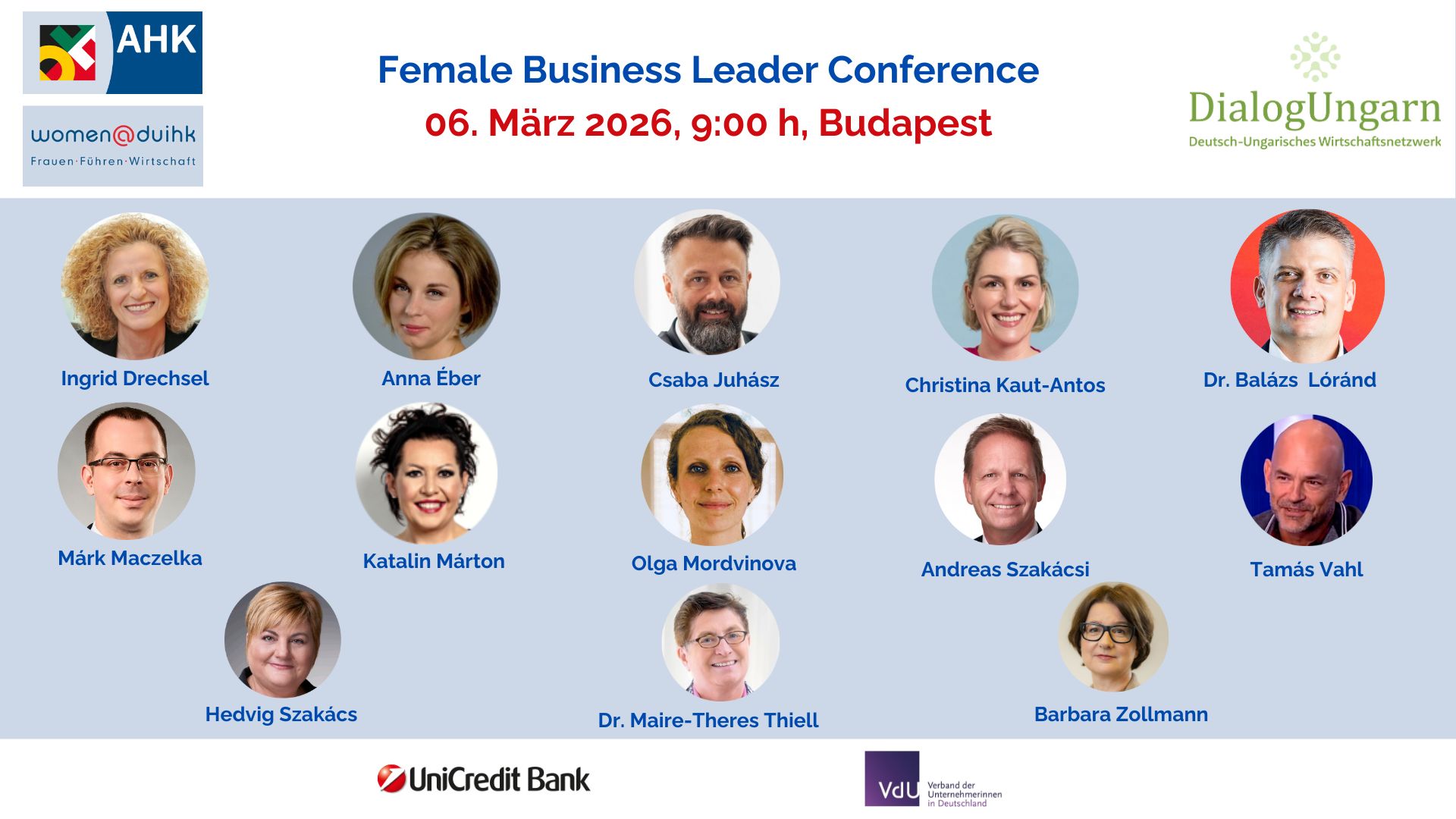 Am 6. März 2026 veranstalten das Frauennetzwerk women@duihk der Deutsch-Ungarischen Industrie- und Handelskammer und DialogUngarn Nonprofit Kft. das vierte Mal die Wirtschaftskonferenz für deutsche und ungarische Unternehmensvertreter*innen zum Internationalen Frauentag. Die Fähigkeit, Menschen authentisch zu verbinden, ist heute der entscheidende Erfolgsfaktor für Unternehmen. In einer sich schnell wandelnden Wirtschaftswelt wird die persönliche Kommunikation für Führungskräfte zum Motor für Innovation, Mitarbeiterbindung und nachhaltigen Unternehmenserfolg. Wir beleuchten dieses zentrale Thema unter verschiedenen Aspekten in drei hochkarätig besetzten Panel-Diskussionen mit führenden Unternehmensvertreterinnen und -vertretern aus Deutschland und Ungarn.